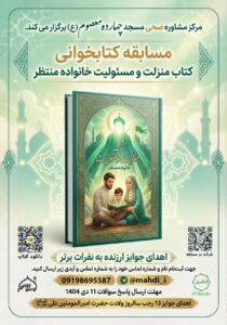 کارگروه خانواده و سبک زندگی موسسه ترویج معارف اسلامی النبأ العظیم با هدف ترویج فرهنگ کتابخوانی، تعمیق فرهنگ انتظار، تحکیم خانواده و تقویت بنیه اعتقادی با مشارکت مرکز مشاوره ضحی و مسجد ۱۴معصوم(ع)، مسابقه کتابخوانی کتاب «منزلت و مسئولیت خانواده منتظر» تالیف جناب آقای حسن ملایی نشر بنیاد فرهنگی مهدی موعود را بمناسبت ایام ولادت حضرت امیرالمومنین علیه السلام برگزار می کند.
